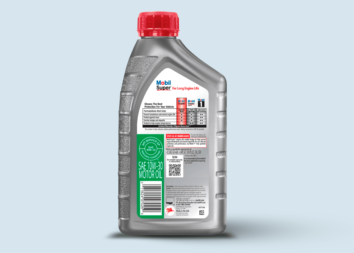 - El aceite de motor de mezcla sintética Mobil Super 10W-30 funciona para proteger su motor de lodos y depósitos por hasta 5,000 millas